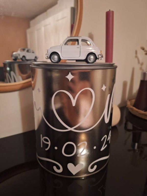 Op het blik komen de namen/initialen van het bruidspaar en de trouwdatum te staan.