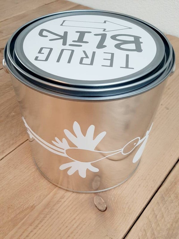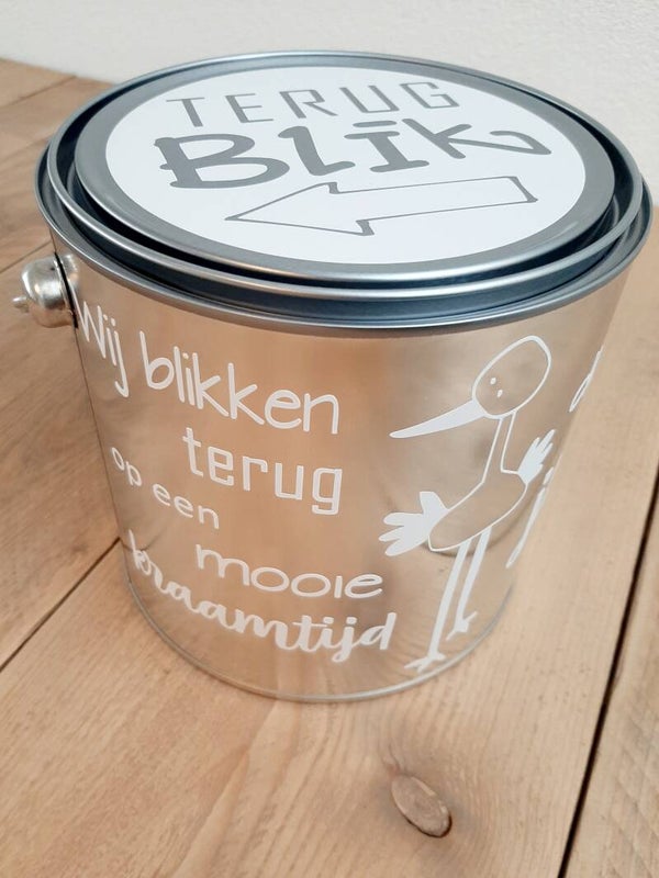 Het blik is makkelijk zelf te vullen met de favoriete thee, chocola of douchegel etc. van de kraamhulp!